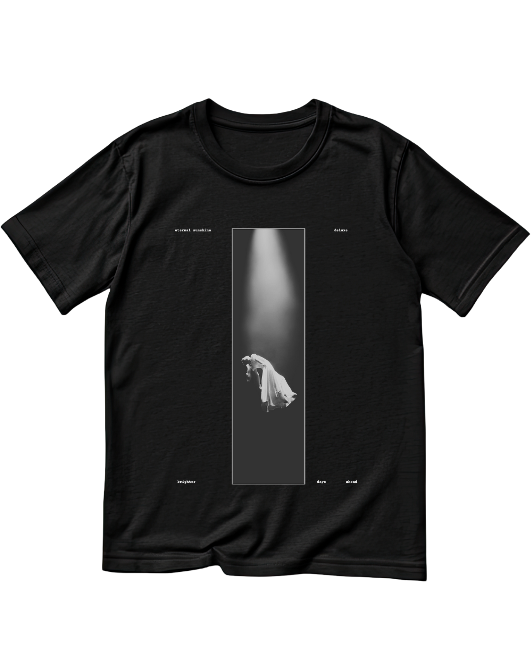Essa não é apenas uma estampa, é uma cena de filme. Inspirada na capa da versão Deluxe de Eternal Sunshine, trazemos a Ariana em seu momento mais etéreo, sendo "abduzida" para longe dos problemas. Com a promessa de "brighter days ahead" (dias melhores virão) estampada na frente, essa peça é um lembrete visual de que, depois da tempestade (e do divórcio, e do drama), a luz sempre volta. Minimalista, monocromática e absolutamente essencial.